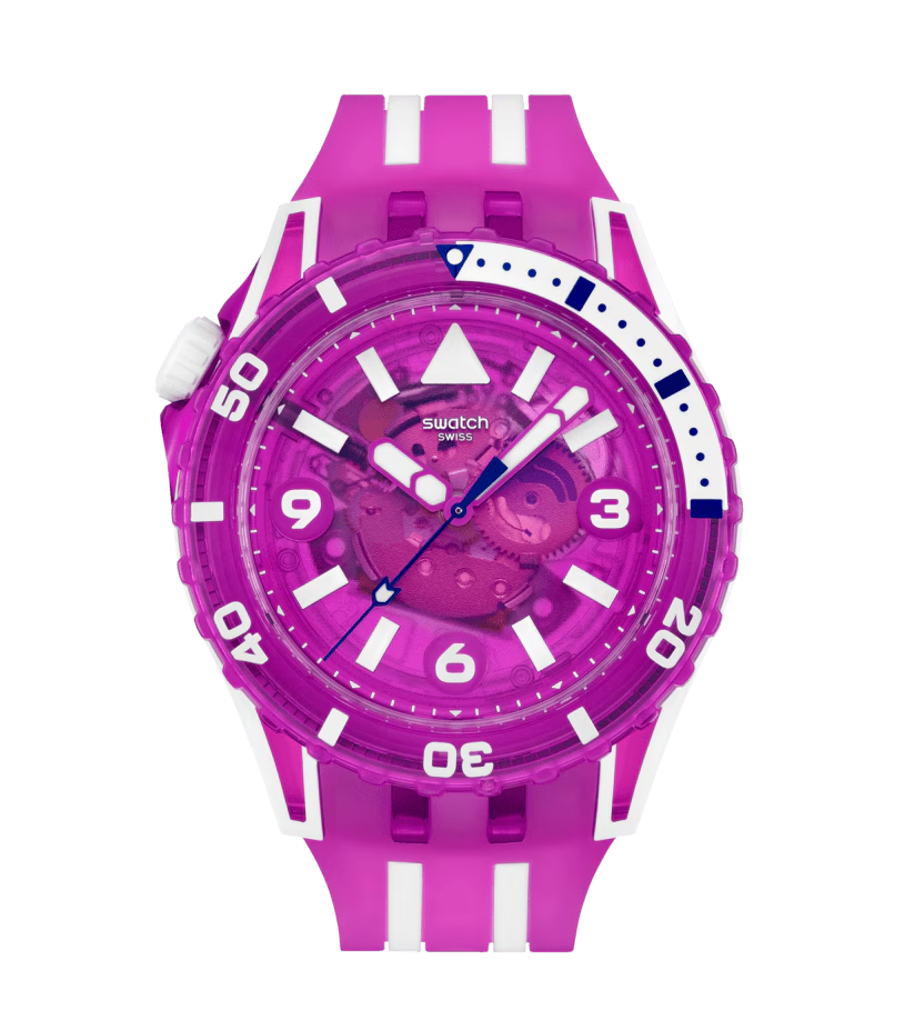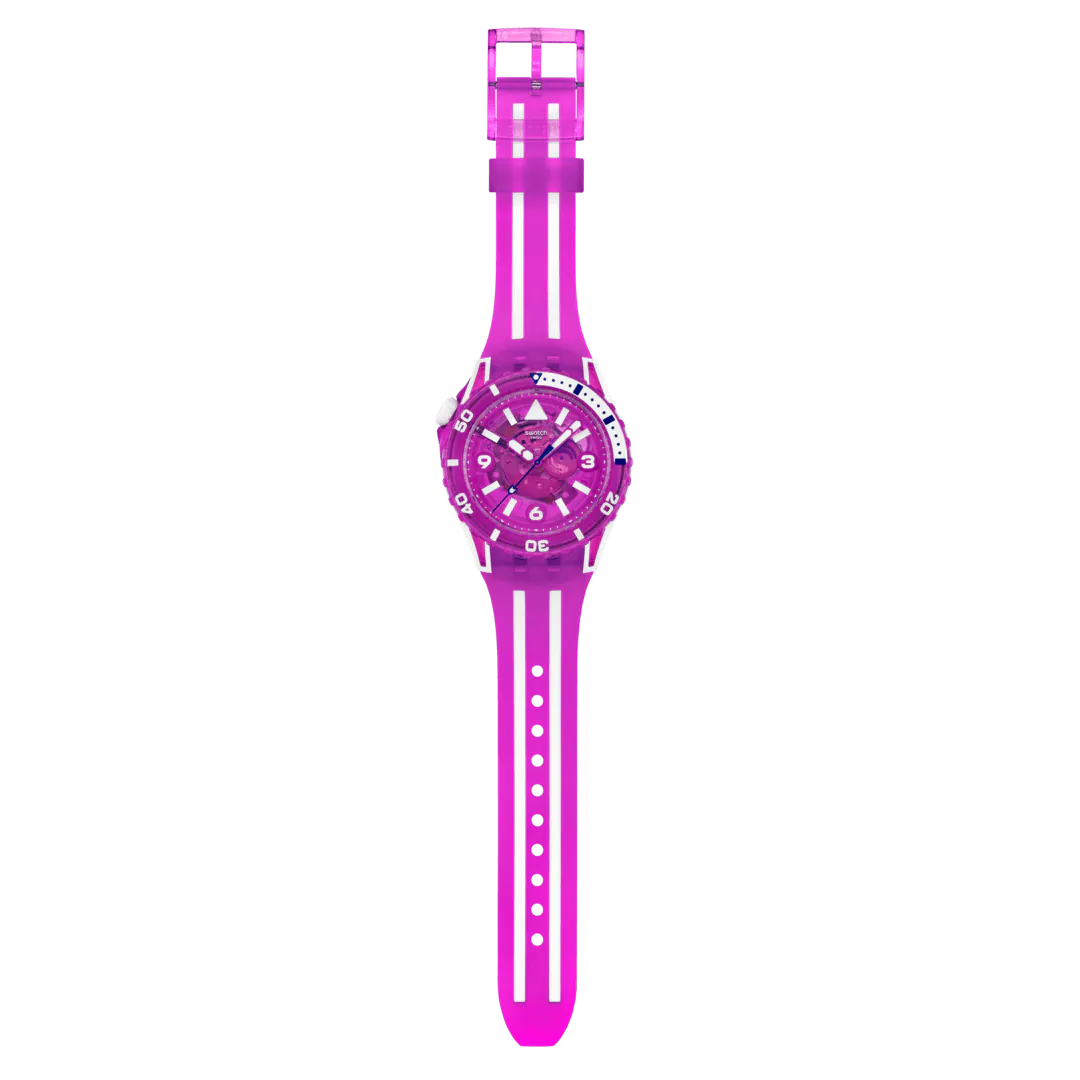 Il quadrante rosa trasparente di questo orologio subacqueo presenta indici e numeri stampati in bianco, lancette delle ore e dei minuti rosa e una lancetta dei secondi blu scuro, tutte con effetto fosforescente, sotto un vetro biosourced. La cassa combina Bioceramic bianco opaco e materiale biosourced rosa trasparente lucido ed è abbinata a una lunetta biosourced rosa trasparente lucido con stampa bianca e blu che si illumina al buio e a una corona in Bioceramic bianco opaco a ore 10. Completano l'orologio un cinturino trasparente bianco e rosa opaco con un passante trasparente rosa opaco e una fibbia trasparente lucida.