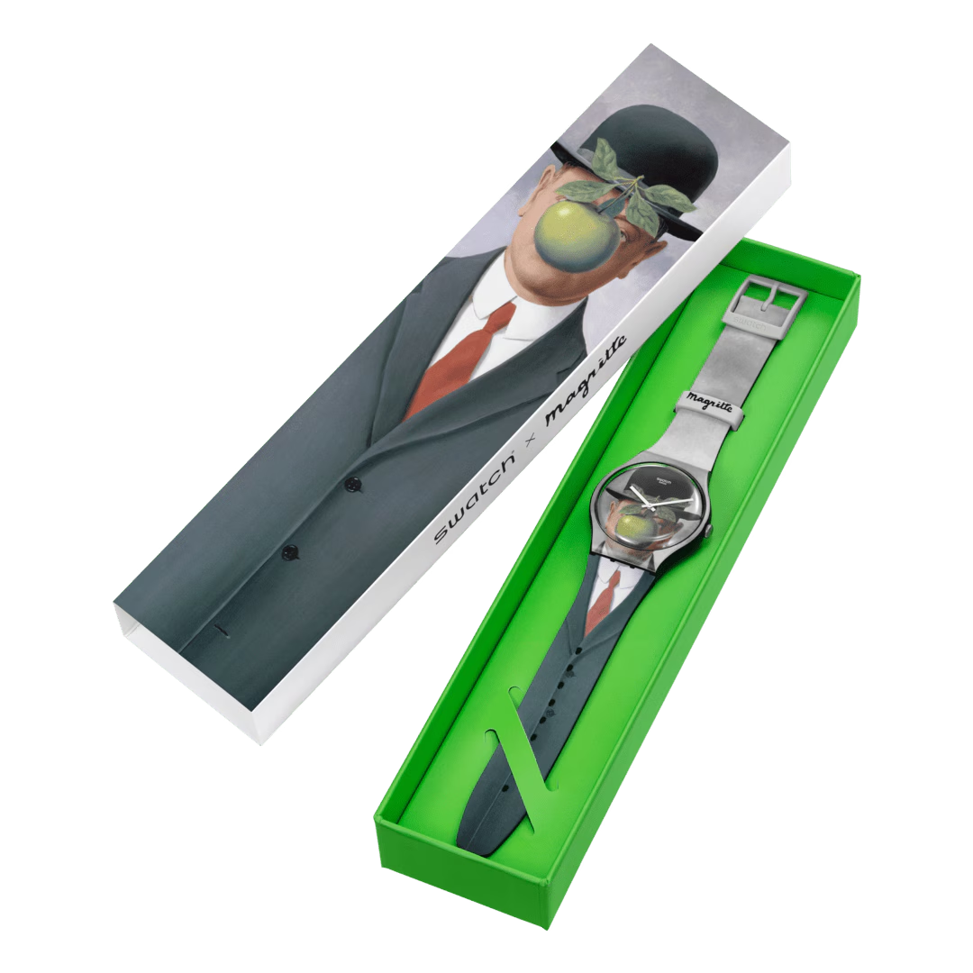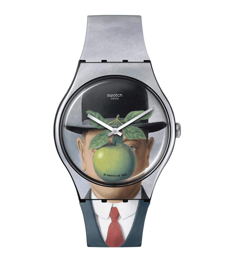 LE FILS DE L'HOMME BY RENÉ MAGRITTE riproduce l’opera surreale di René Magritte, Figlio dell’uomo, stampata in continuum sulla parte anteriore del quadrante multicolore, della cassa e del cinturino. Il retro del cinturino gioca con la natura surreale dell’opera, usando la frase "Ceci est une Swatch avec une pomme." (“Questo è uno Swatch con una mela”). Anche il passante è stampato con il nome dell’artista.© Succession René Magritte - SABAM, Belgium, 2023 / BKW Editions