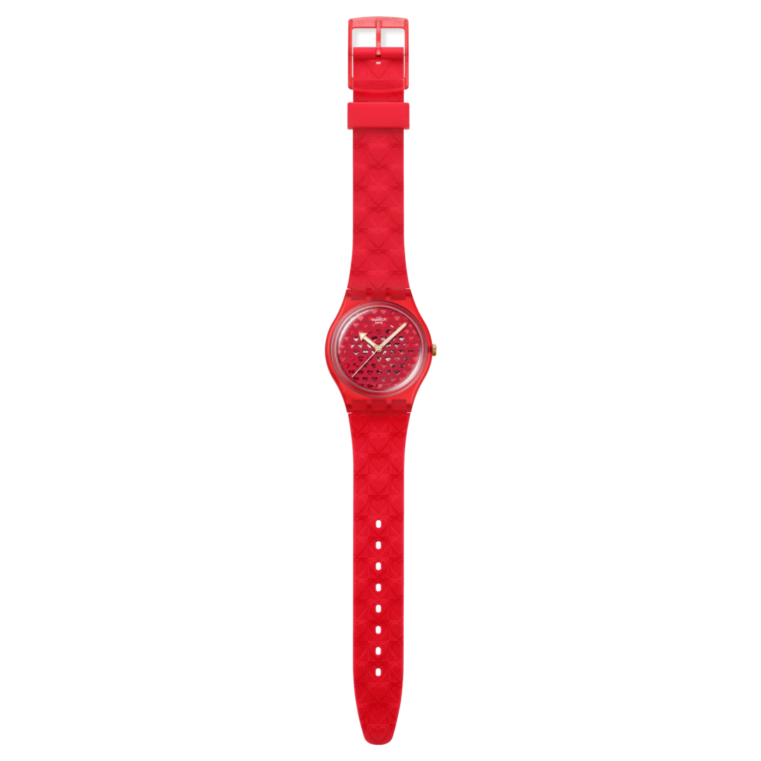 Questo Speciale San Valentino presenta un quadrante rosso con intagli a forma di cuore che lasciano intravedere il meccanismo interno, lancette delle ore e dei minuti color oro che si illuminano al buio e una lancetta dei secondi bianca, il tutto sotto un vetro biosourced in una cassa trasparente e opaca rossa sempre di origine biologica. Completano l’orologio il cinturino rosso opaco con motivo a cuore in rilievo, un passante rosso opaco e la fibbia trasparente e opaca rossa.