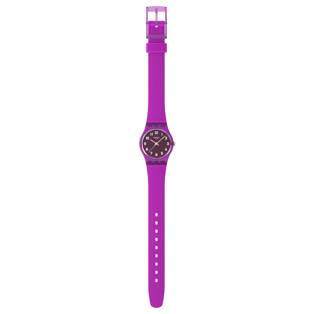 Questo orologio presenta un quadrante testurizzato marrone con numeri stampati bianchi, lancette delle ore e dei minuti arancione chiaro che si illuminano al buio e una lancetta dei secondi verde chiaro in una cassa trasparente e opaca viola. Il cinturino testurizzato viola opaco è completato da un passante viola opaco e da una fibbia viola trasparente e opaca LV122