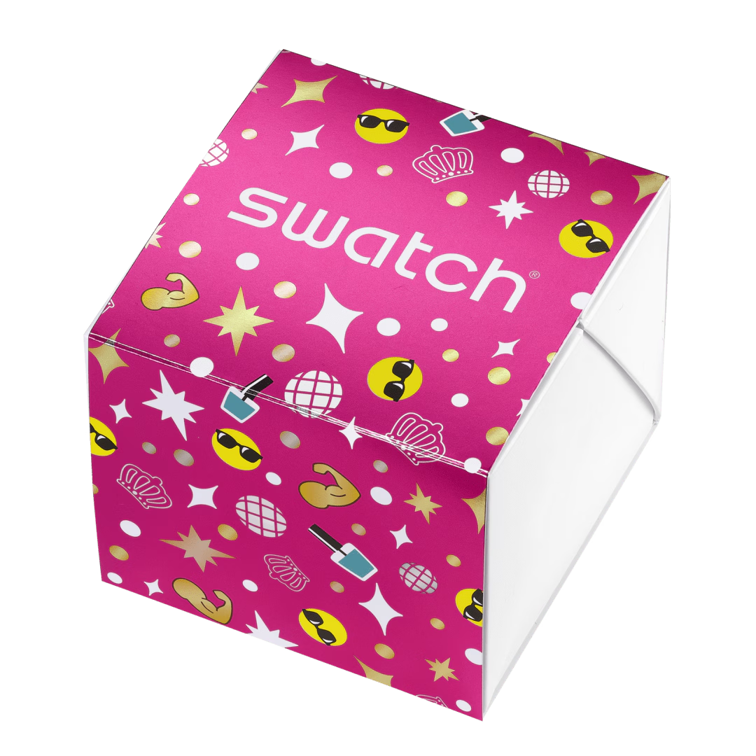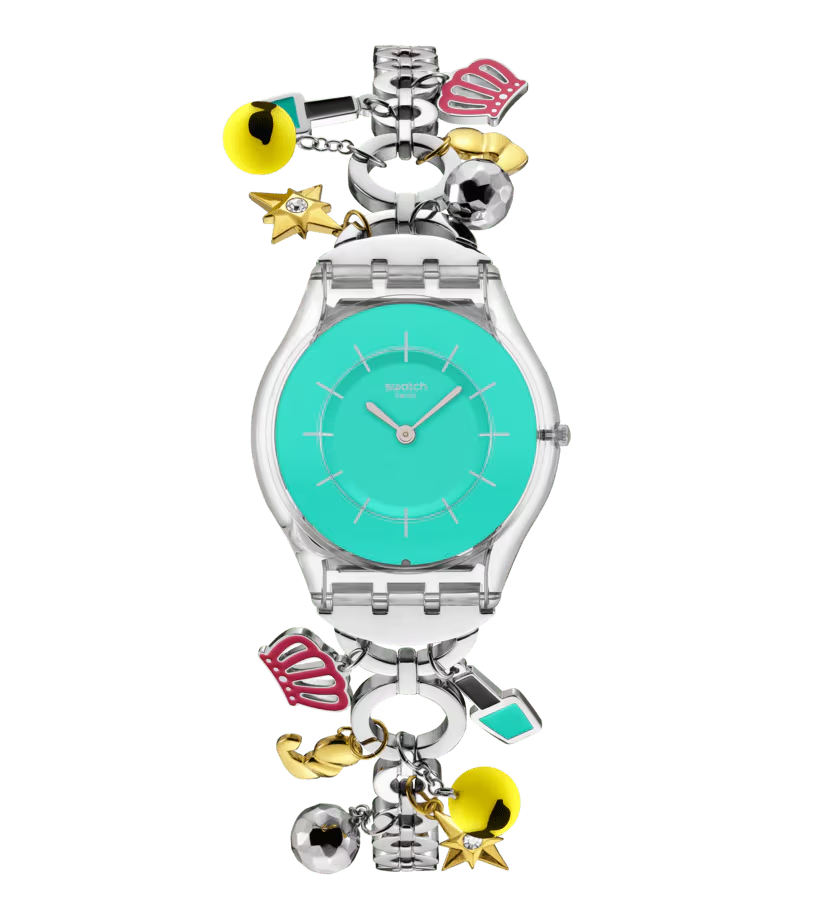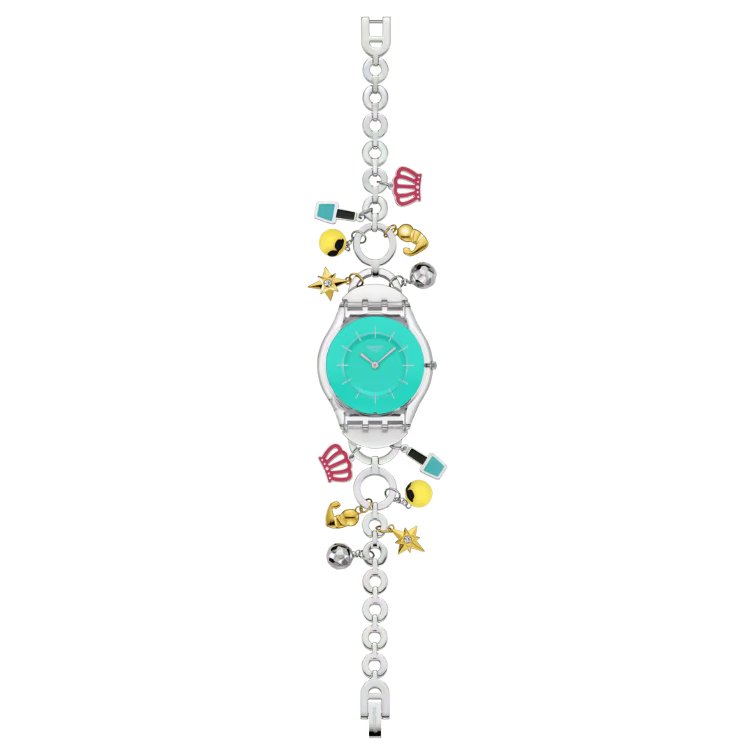 Questo speciale modello per la Festa della Mamma presenta un quadrante turchese con indici stampati color argento e lancette delle ore e dei minuti sempre in argento in una cassa trasparente lucida biosourced. Il bracciale in acciaio inossidabile lucido presenta ciondoli assortiti in forma di emoji, come lo smalto per unghie, la corona, la faccina sorridente con gli occhiali da sole, la stella, il bicipite flesso e la sfera da discoteca SS08Z106G