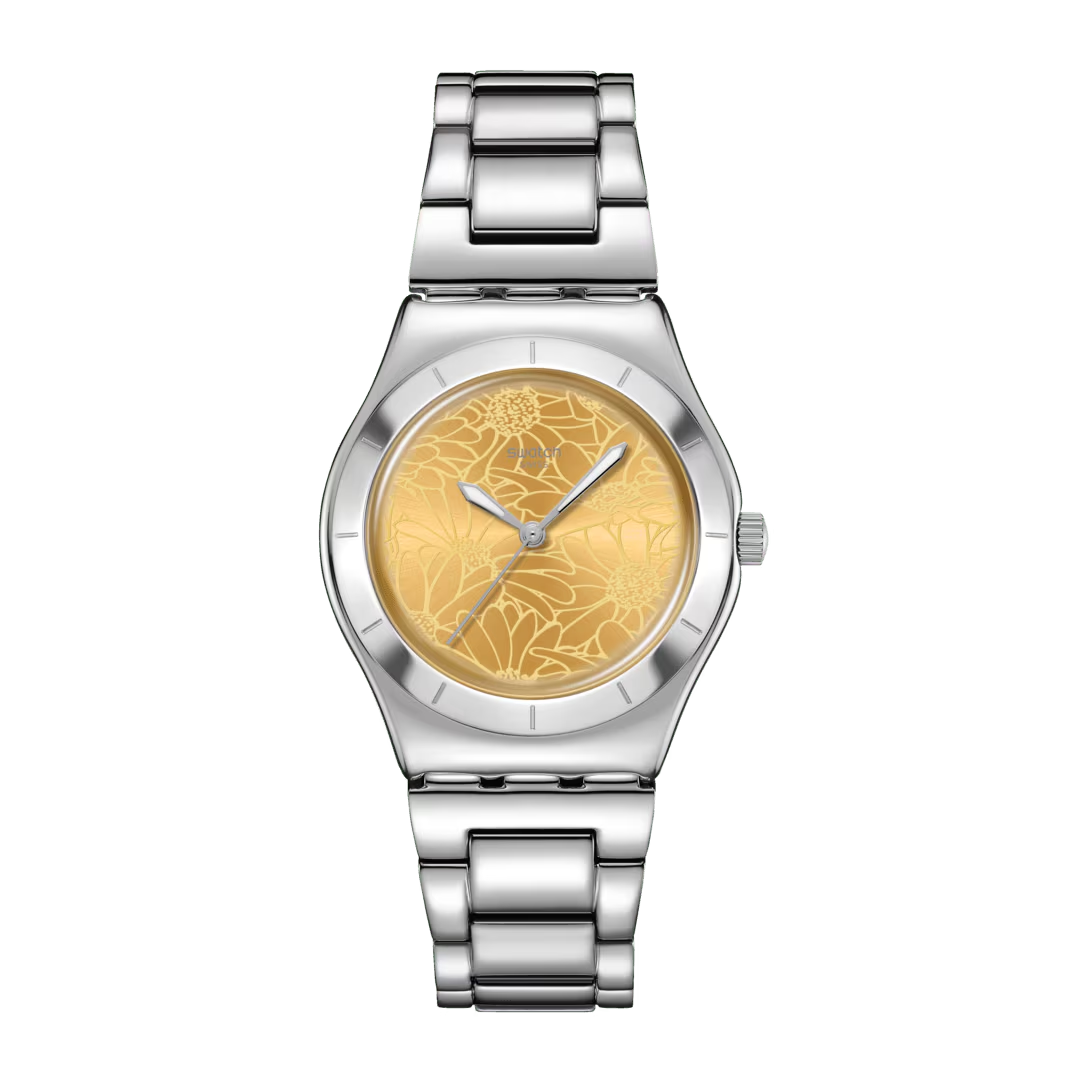 Questo elegante orologio in acciaio inossidabile presenta un quadrante giallo spazzolato soleil con un motivo floreale stampato in giallo chiaro, lancette delle ore e dei minuti color argento che si illuminano al buio e una lancetta dei secondi sempre di color argento. L'orologio ha una cassa in acciaio inossidabile lucidato e una lunetta abbinata con indici incisi. Completano il look un bracciale in acciaio inox lucidato con una fibbia a farfalla.