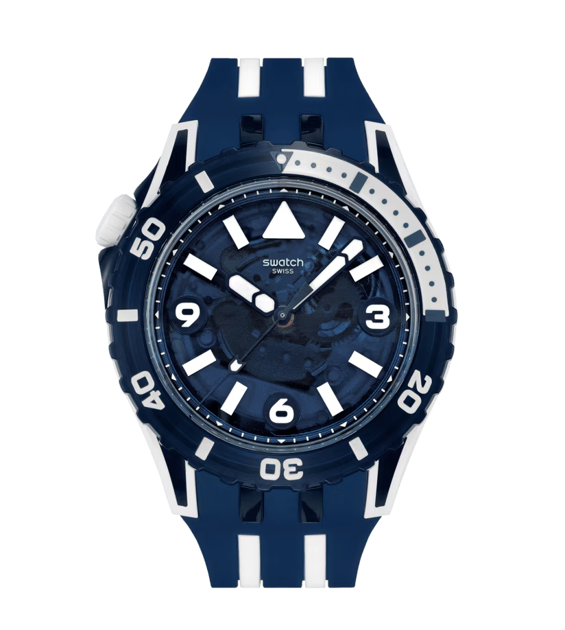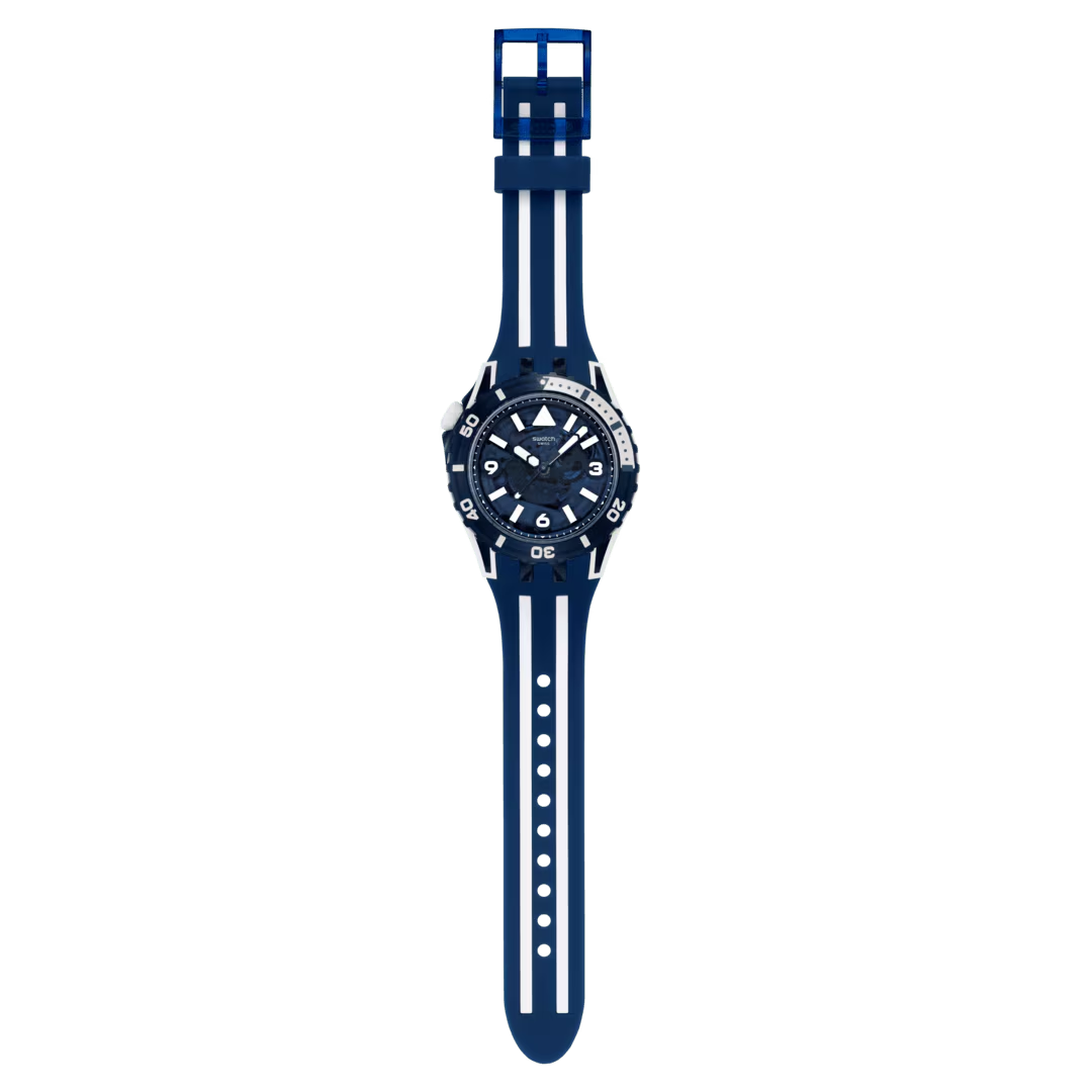 Il quadrante blu trasparente di questo orologio subacqueo presenta indici e numeri stampati in bianco, lancette delle ore e dei minuti blu e lancette dei secondi grigie, tutte con effetto fosforescente, sotto un vetro biosourced. La cassa combina Bioceramic bianco opaco e materiale biosourced blu trasparente lucido ed è abbinata a una lunetta biosourced blu trasparente lucido con stampa grigia e bianca che si illumina al buio e a una corona in Bioceramic bianco opaco a ore 10. Completano l'orologio un cinturino trasparente blu scuro opaco con passante dello stesso colore e fibbia blu scuro trasparente lucido.
