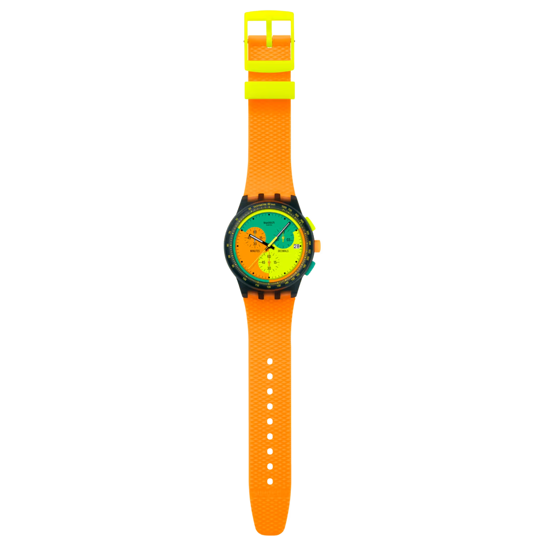 Questo cronografo rétro si ispira a uno Swatch CHRONO degli anni '90: il SIGNAL FLAG da collezione (SCN101). Il quadrante multicolore presenta lancette delle ore e dei minuti nere che si illuminano al buio, lancetta dei secondi del cronografo gialla e datario a ore 3. La cassa nera opaca trasparente è completata da una lunetta coordinata con scala tachimetrica stampata in giallo. Completa l’orologio un cinturino testurizzato arancione opaco con passante e fibbia color giallo opaco.